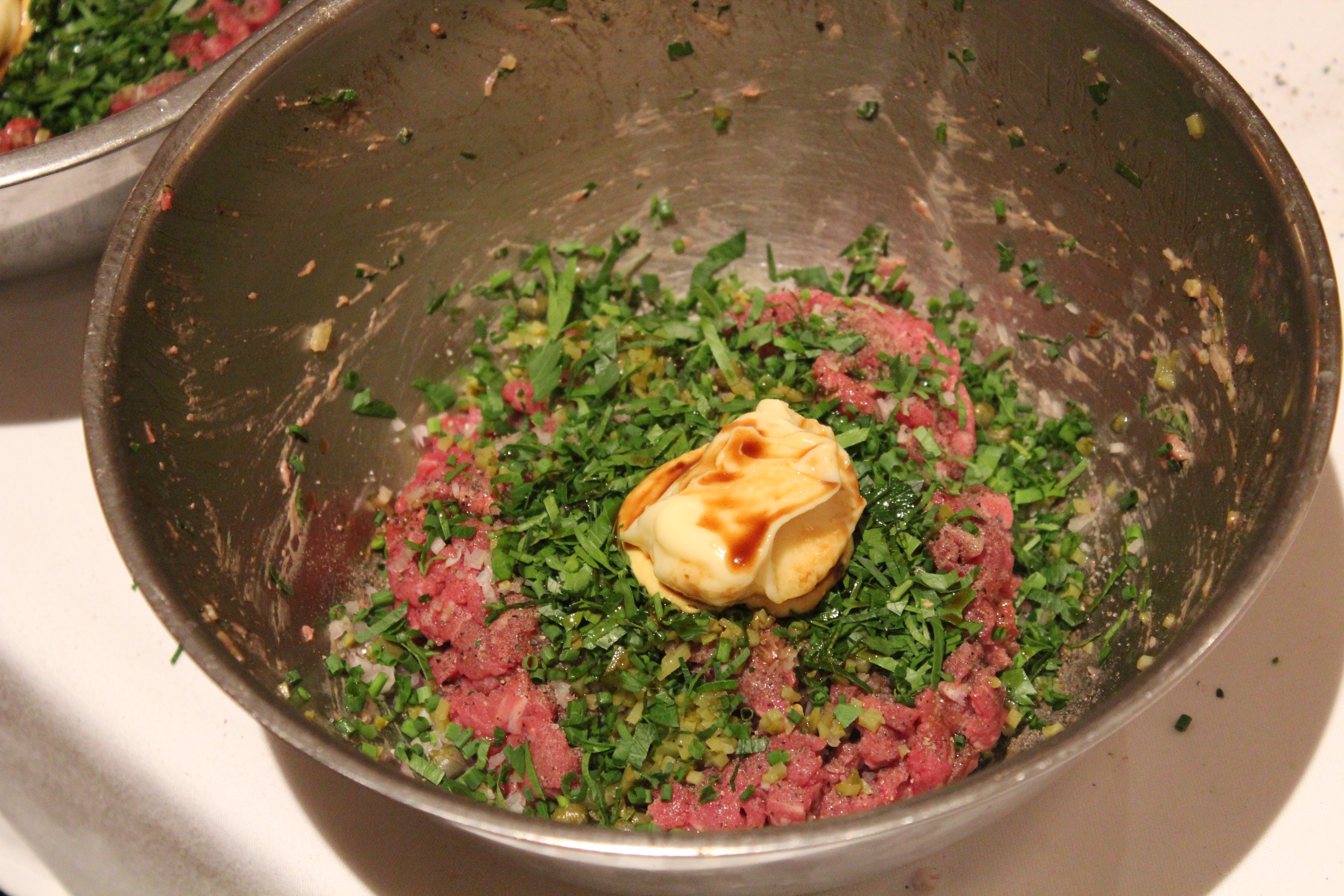 Didier Leroy of Didier demonstrated his classic French technique, mixing hand-chopped beef fillet with minced shallots, capers, cornichons and generous handfuls of parsley and chives. He moistened the mixture with homemade mayonnaise, a generous spoonful of Dijon mustard, a few judicious drops of Tabasco and “sauce anglaise”, a.k.a. Worcestershire sauce.