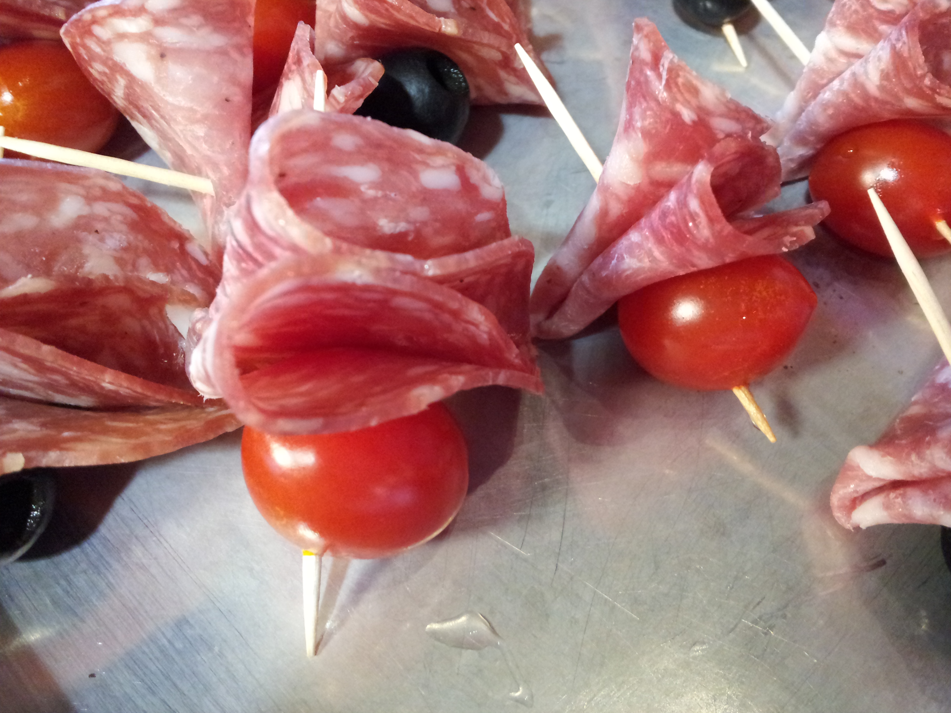 Another chef demonstrated an easy way to present Mastro’s genoa salami. Take one thin circular slice, fold it in half then fold it in quarters. Put a toothpick through the centre and pop a grape tomato on the end. Another instant appetizer! Skewer an olive on half the slices for colour contrast.