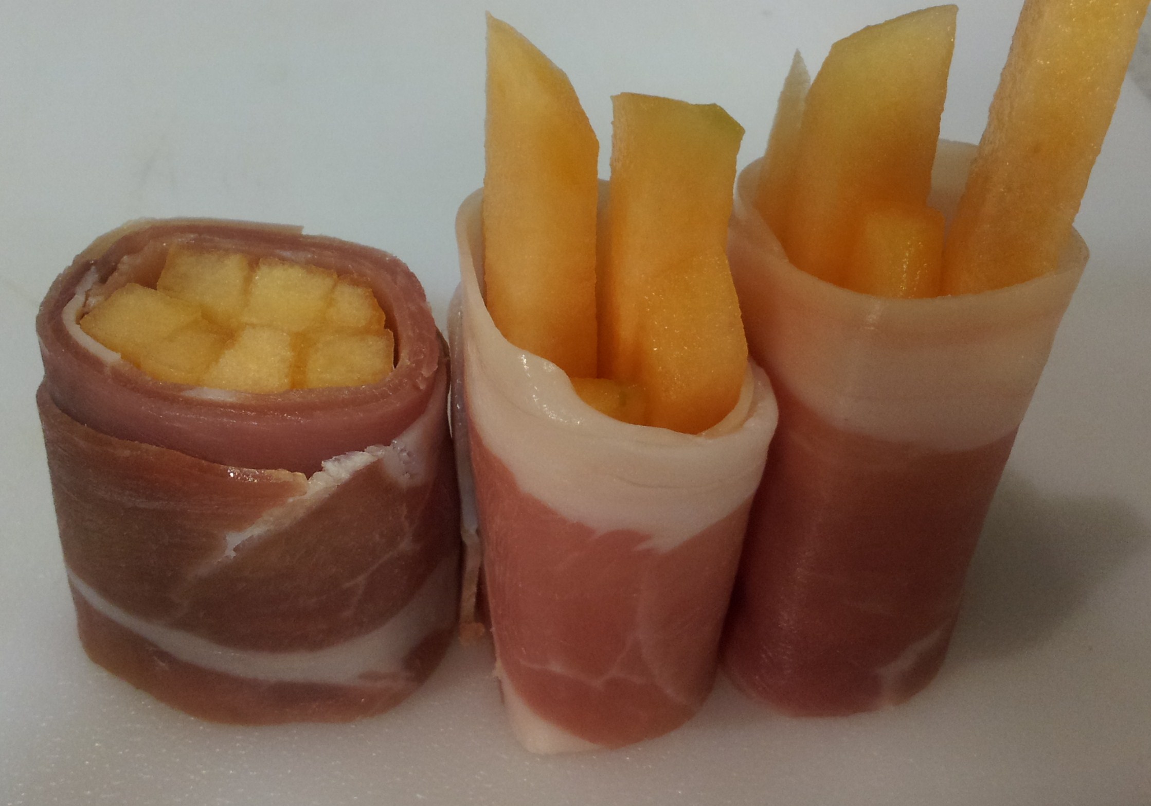 o ends have cantaloupe sticking out like fries unless you cut them. Either way, it’s a delicious appetizer. You could also use blanched asparagus.