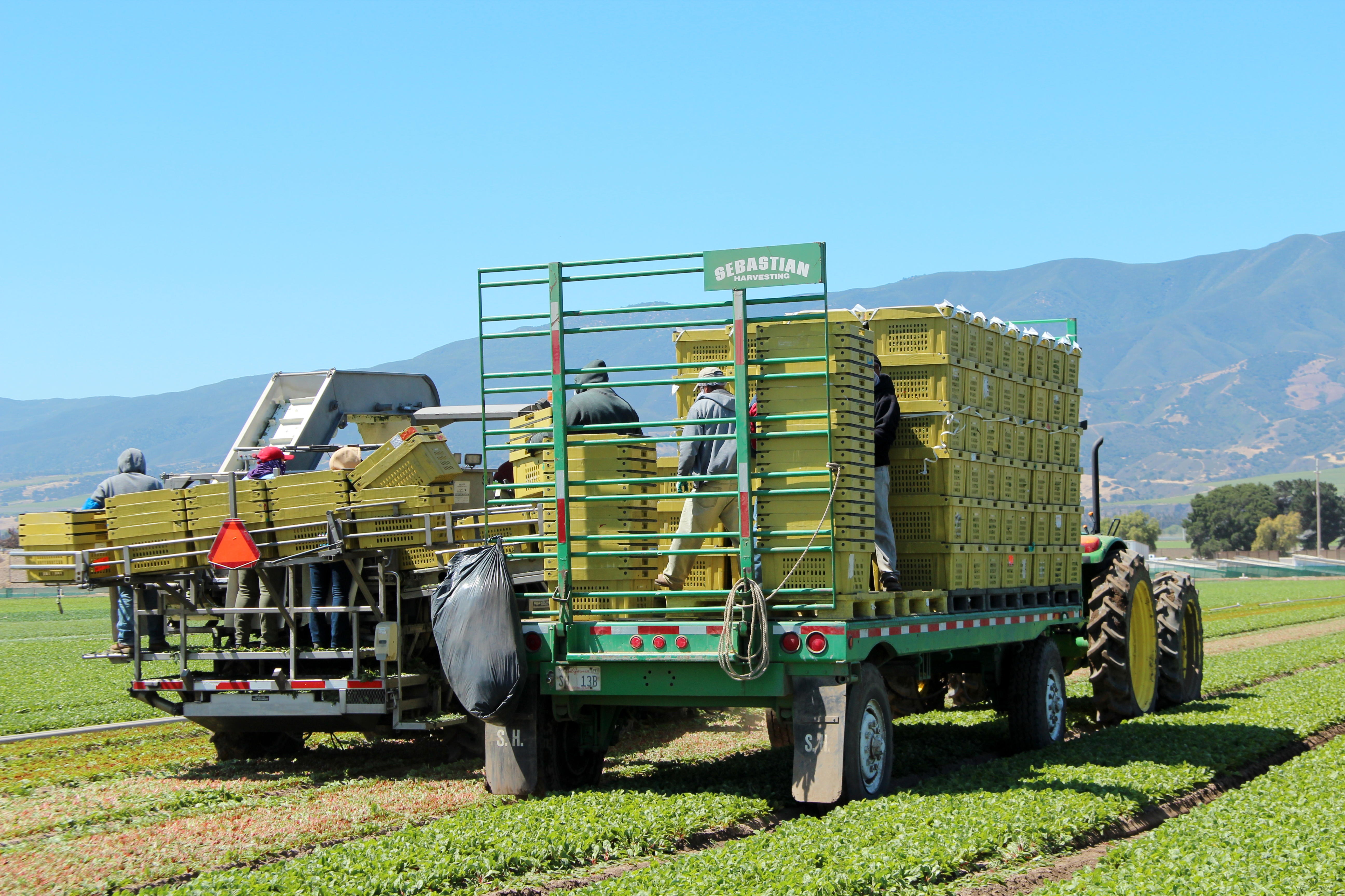 In another field, rows of baby greens are being harvested by a giant lawn mower. A blast of air brings the cut greens into the machine and shoots them up to the wagon tethered alongside, where workers capture the leaves in plastic-lined bins.