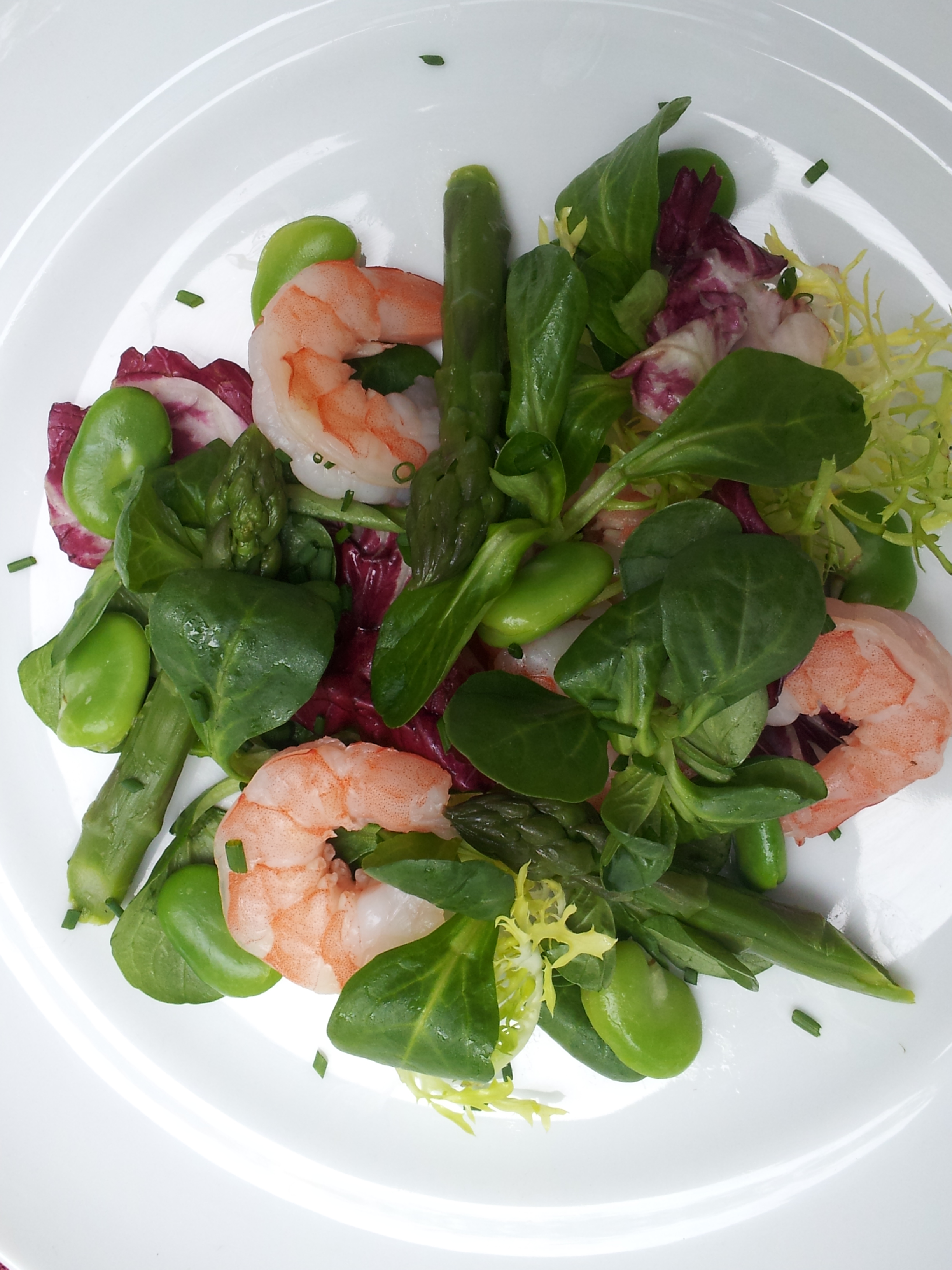 In bowl with favas, toss asparagus, shrimp and greens with just enough dressing to coat everything. Garnish with chives and serve immediately with remaining dressing on the side.