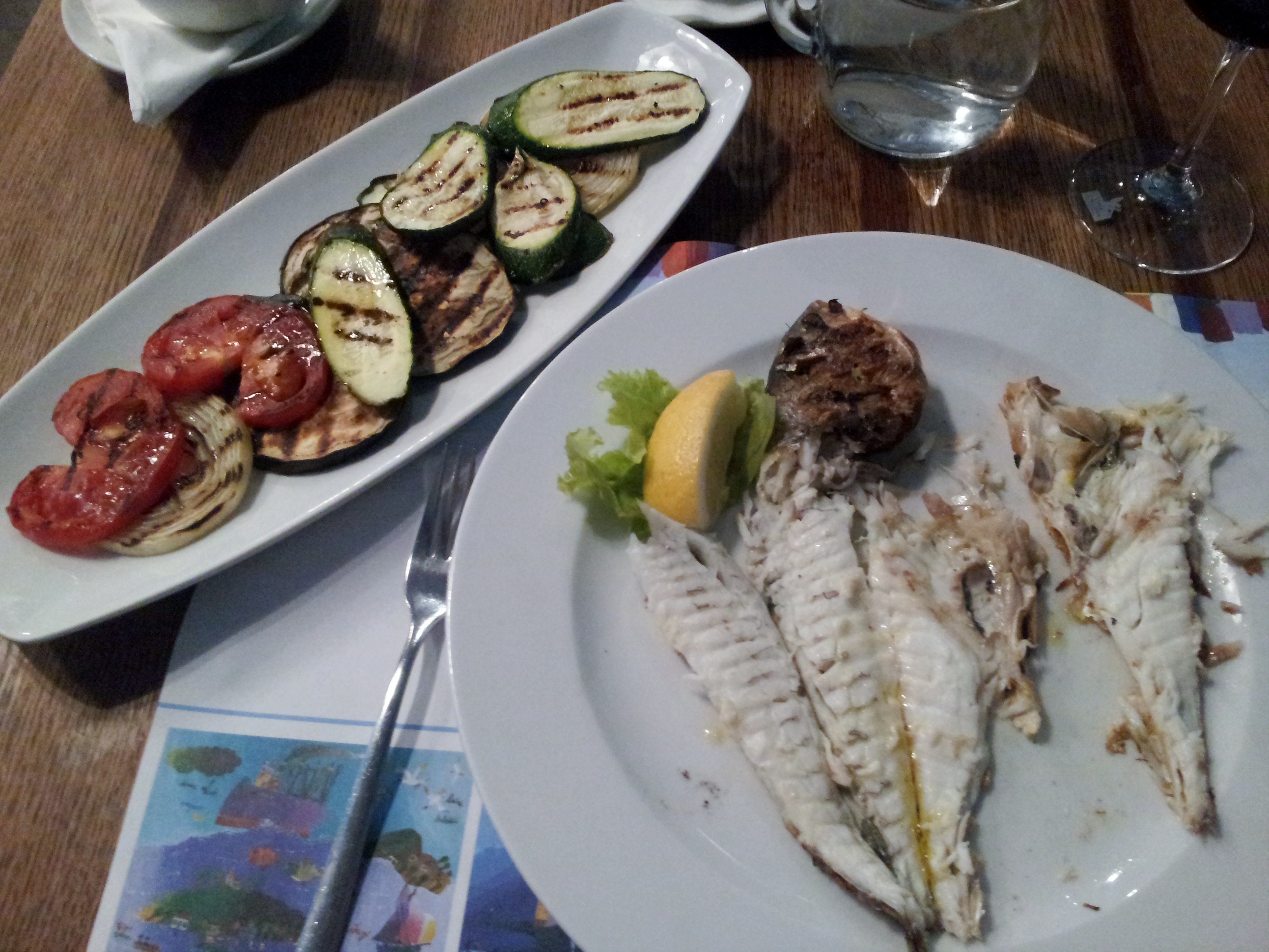 With his help I chose grilled orata and a plate of grilled vegetables. He cleaned the fish at the table so I didn’t have to deal with bones, and brought a little sauceboat of minced garlic in olive oil to sprinkle over top. I have to say it was the Best Fish Ever. Pure white and almost fluffy, mild and sweet. I even ate the skin, crisp and sweet as candy.