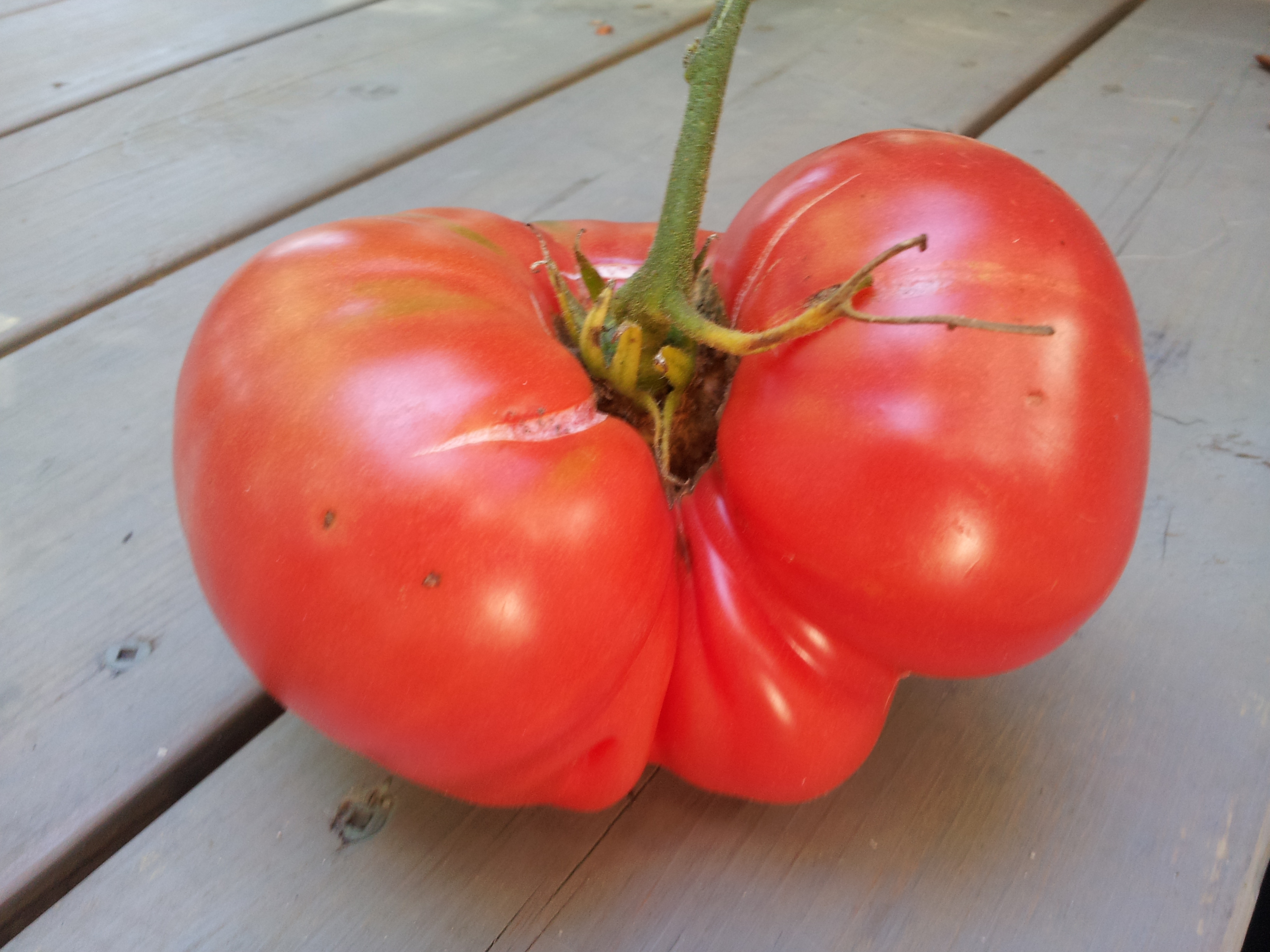 When I heard a lot of people have been disappointed with their grafted tomatoes from President’s Choice, new this year, I figured I’d better weigh in with this bruiser of a brandywine from our back-lane garden. No, it’s not the least bit round, but it was delicious!