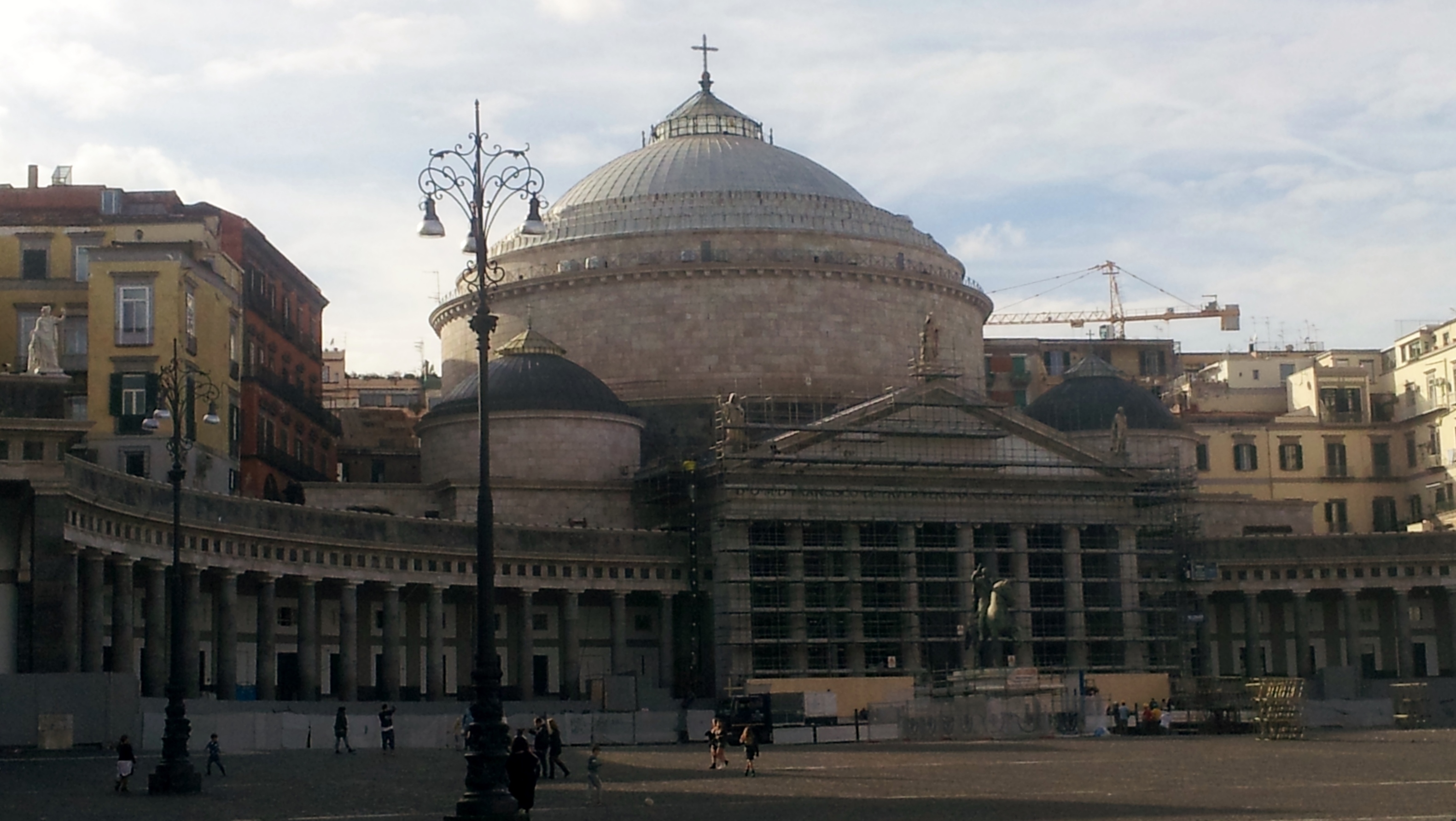 shrouded for re-construction, and a monumental round-roofed pile in the wide empty piazza del Plebiscito, where you can look up to one of several giant castles on the hill from the days when this area was a kingdom. Across the bay, past the busy port and the cruise ships at rest, stood the twin peaks of Mount Vesuvius, which last erupted in the 1940s.