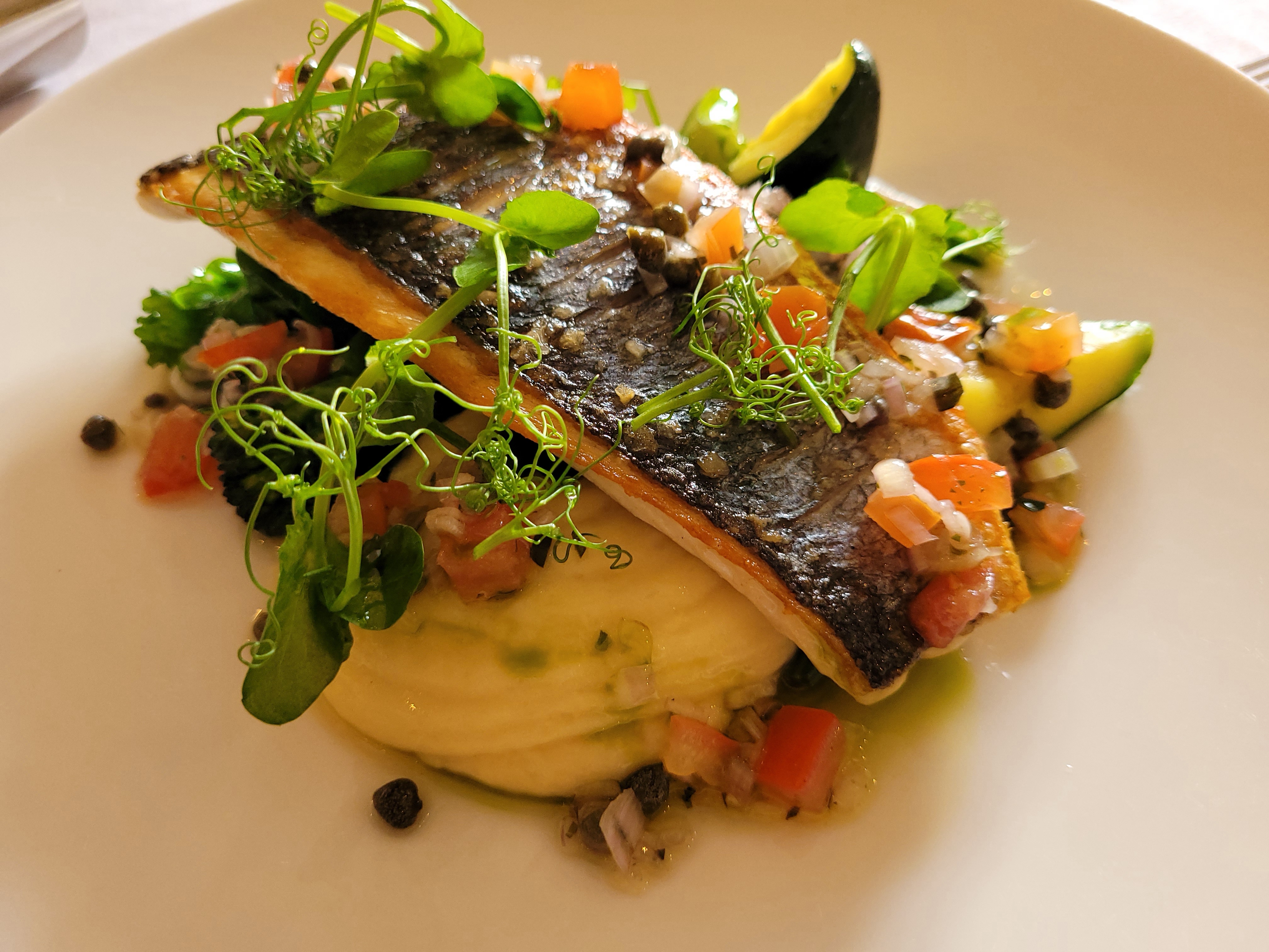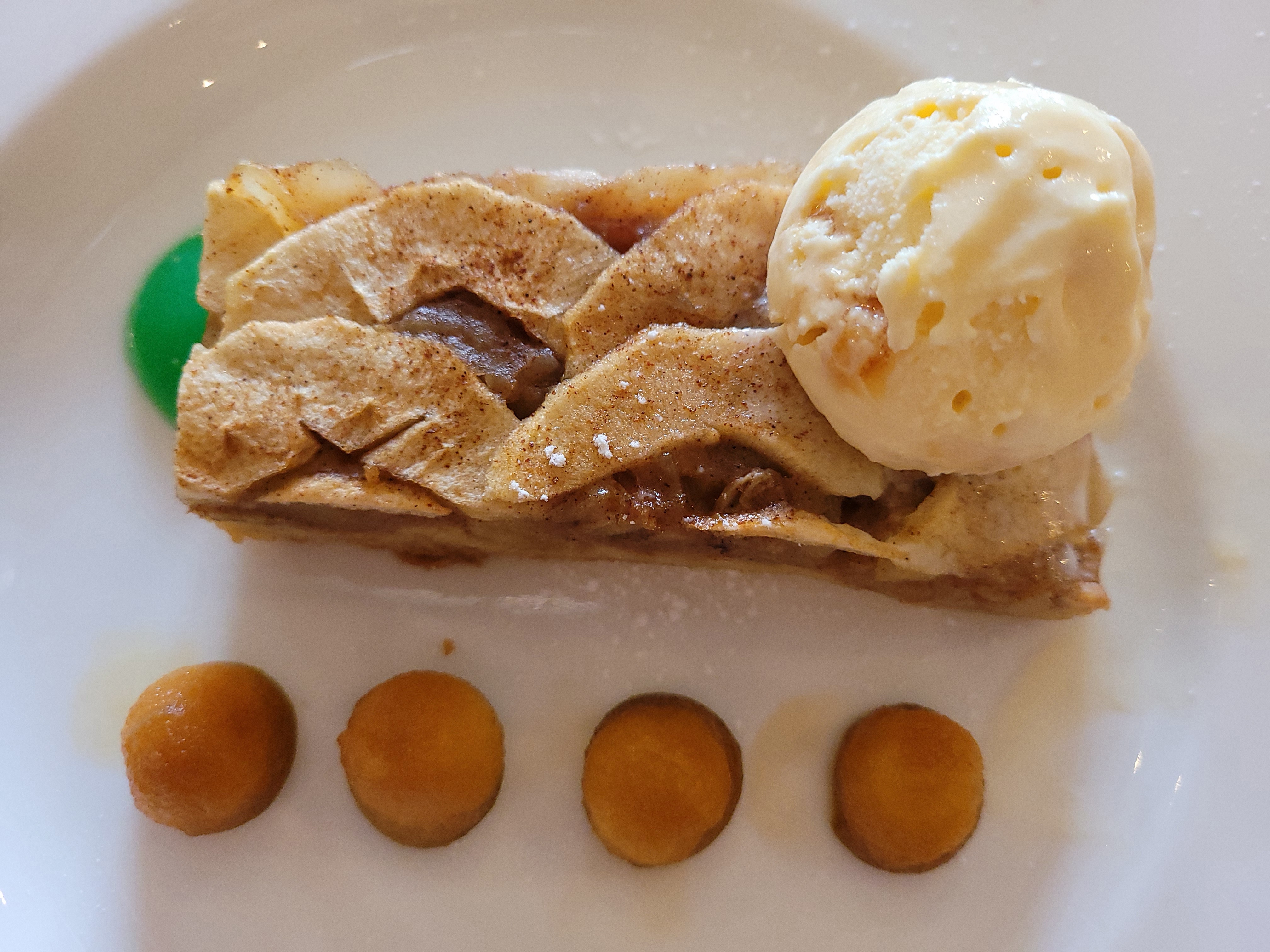 All three courses suggested by my attentive young server were delicious and beautifully-presented. A twice-baked souffle of double Gloucester cheese. Pan-fried sea bream with mashed potato, cauliflower puree and a jumble of wilted kale, broccoli, beans and zucchini. A slice of warm apple and frangipane tart with honeycomb ice cream as scrumptious as it looked. Even the glass of Sancerre wine accompanying dinner was perfect.