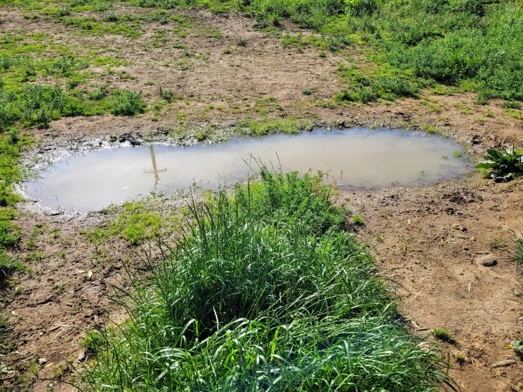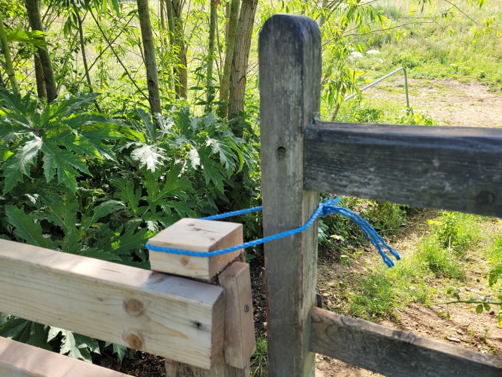 Though it hadn’t rained for two days, there was the puddle as advertised. And a gate tied with a blue string, and an old apple and cherry orchard.