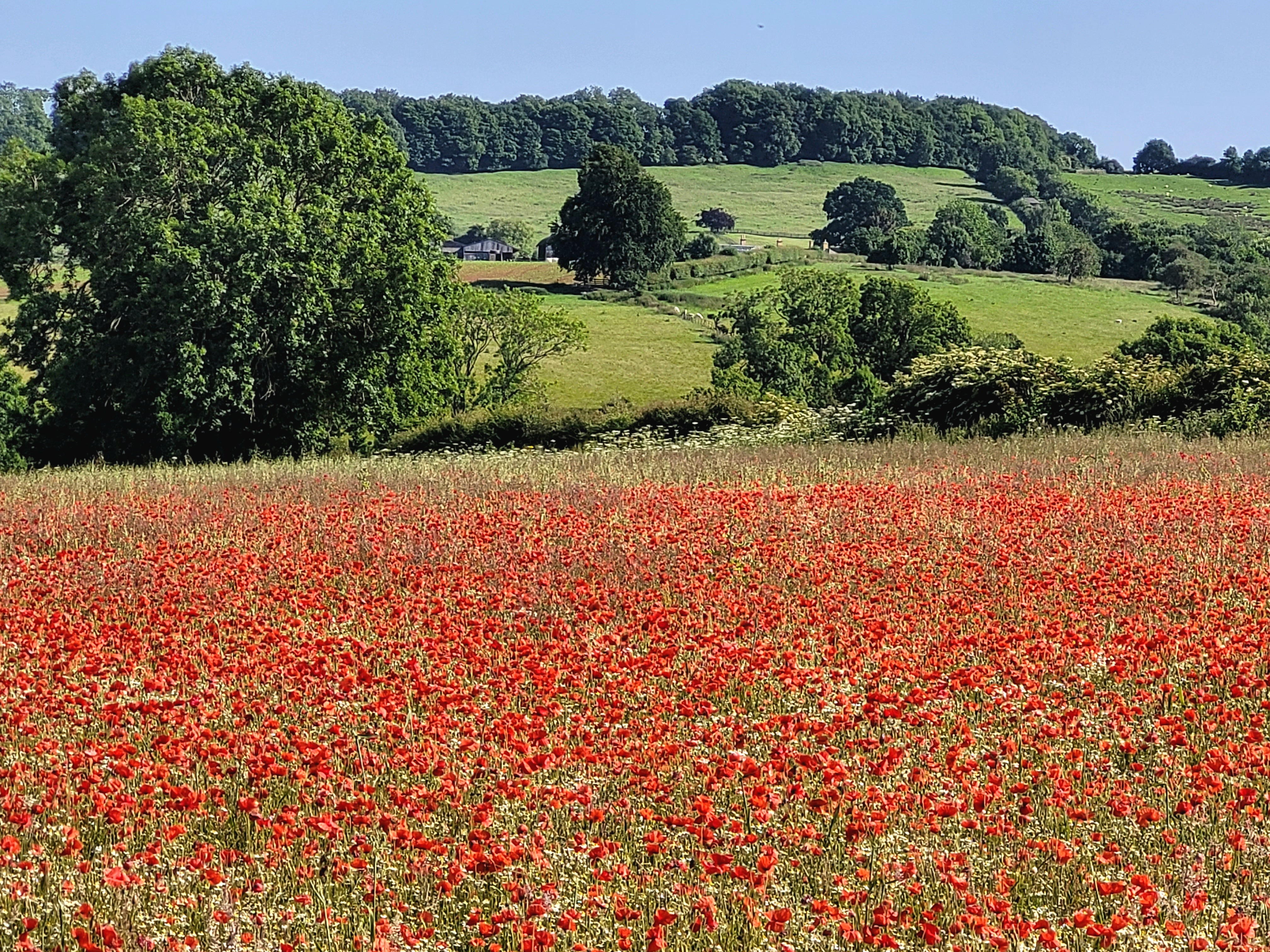 Off I went, occasionally plowing through bush when the path threatened to disappear. As I reached the poppies, St. James’ tower came into view. Easy! Just then the young woman reappeared from the other direction and waved. Back through the gates I went to the sheep pasture at Campden House then back into town as if I’d never left.
