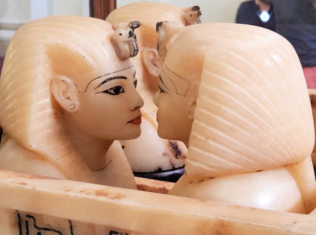 Some of my favourites were the sacred canopic jars, four per person, used to store one’s stomach, intestines, lungs and liver for use in the afterlife. King Tut’s jars were especially lovely, carved with life-like alabaster heads. The heart, believed to be connected to the soul, was left inside the body.
