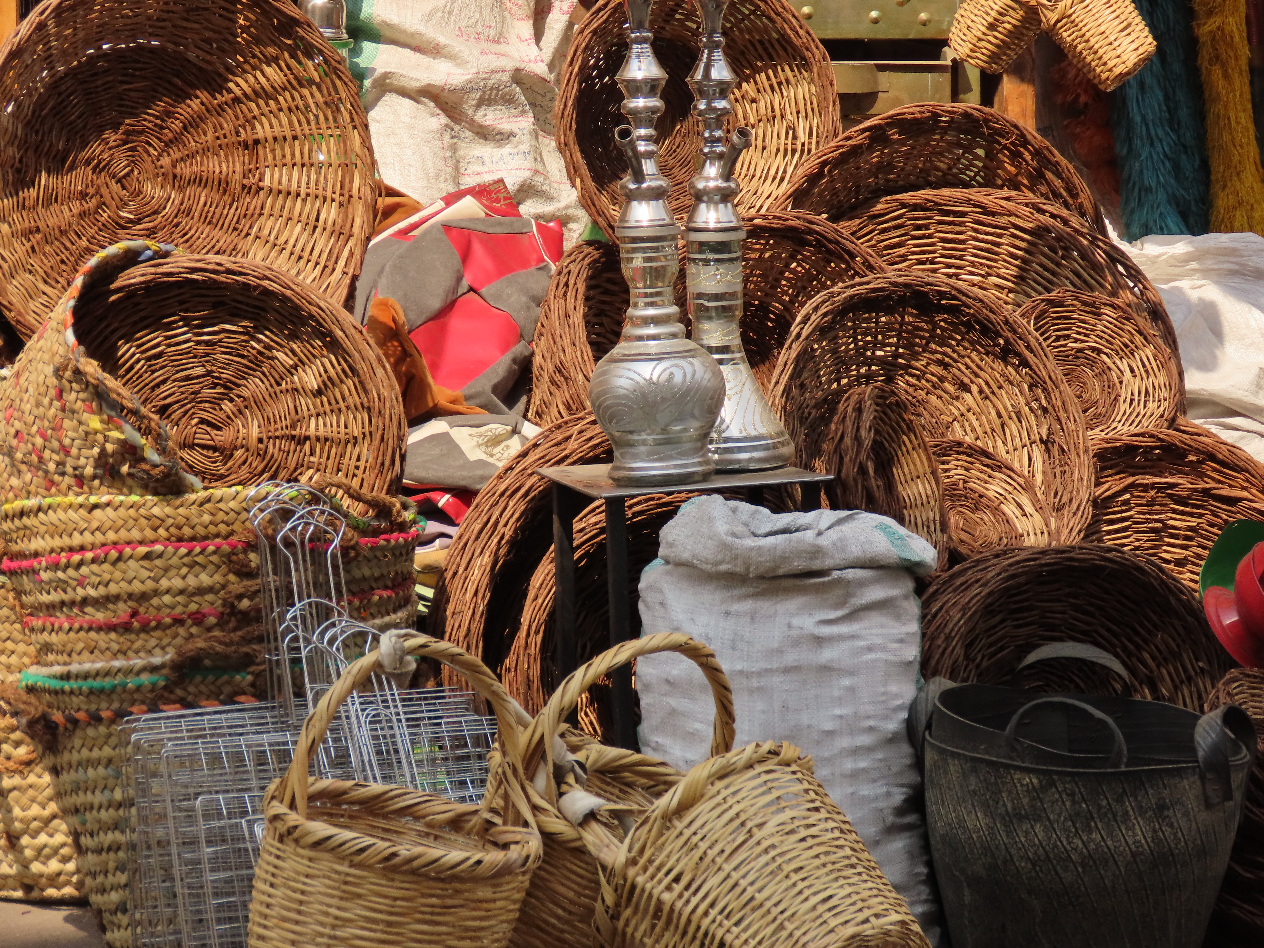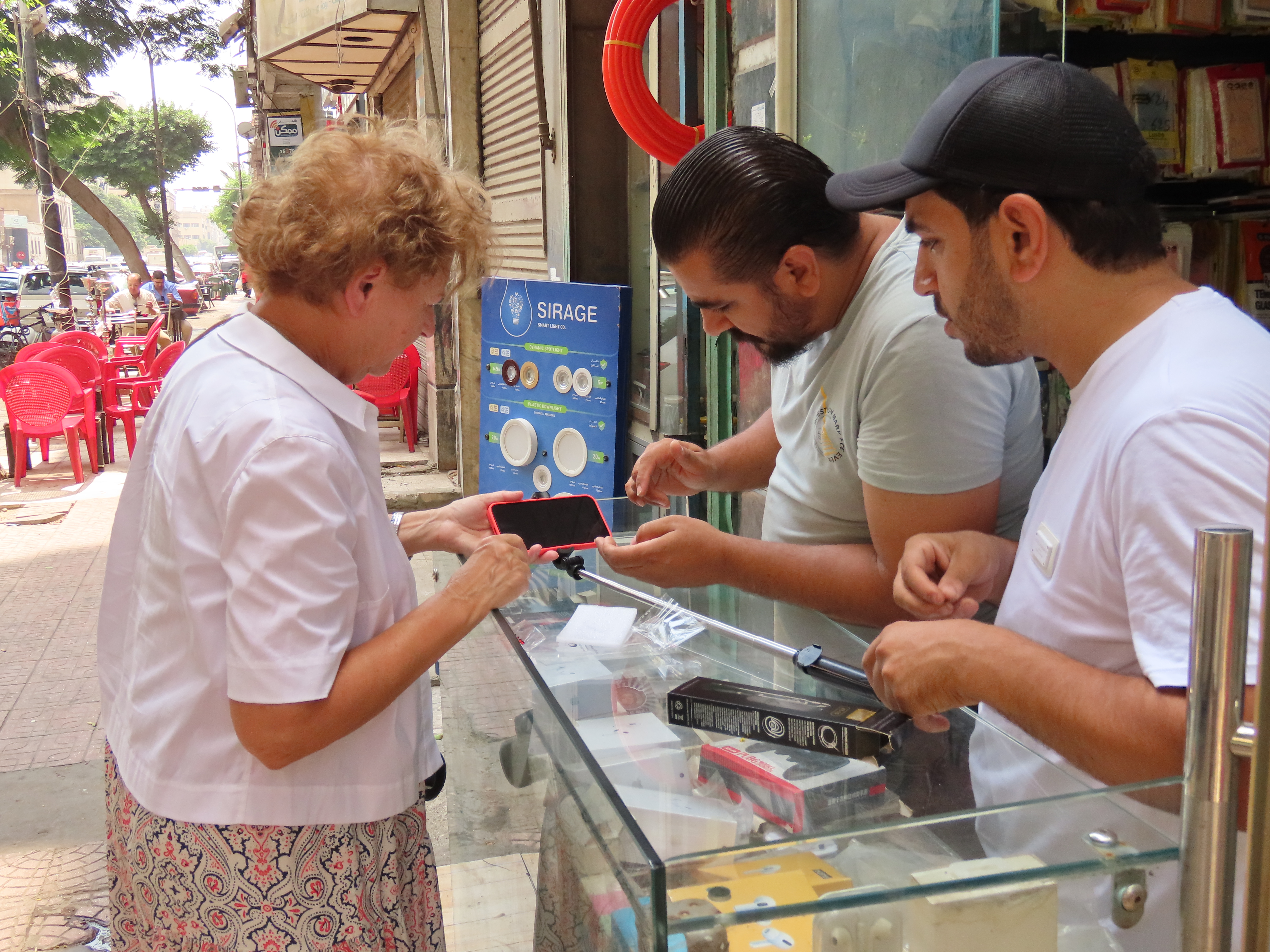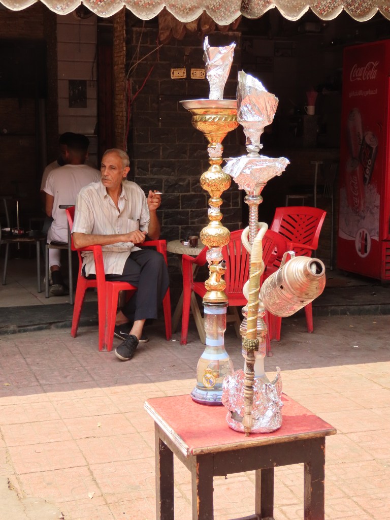 The following day we found ourselves in a more upscale neighbourhood with a few trees, graceful minarets, stately government buildings, coffee shops and useful places like the hole-in-the-wall tech shop where we had fun buying a selfie stick (for the Pyramids) and new cell phone covers. Of course the salesman didn’t have any selfie sticks in stock but no worries, he called a friend, or perhaps the owner, who arrived by motorcycle a good 15 minutes later, wares in hand. While we waited he found us chairs to sit on and produced an older gentleman who spoke English. Who translated as the guys smoking shisha next door explained how they heat the flavoured charcoal pellets for their hookah pipe.