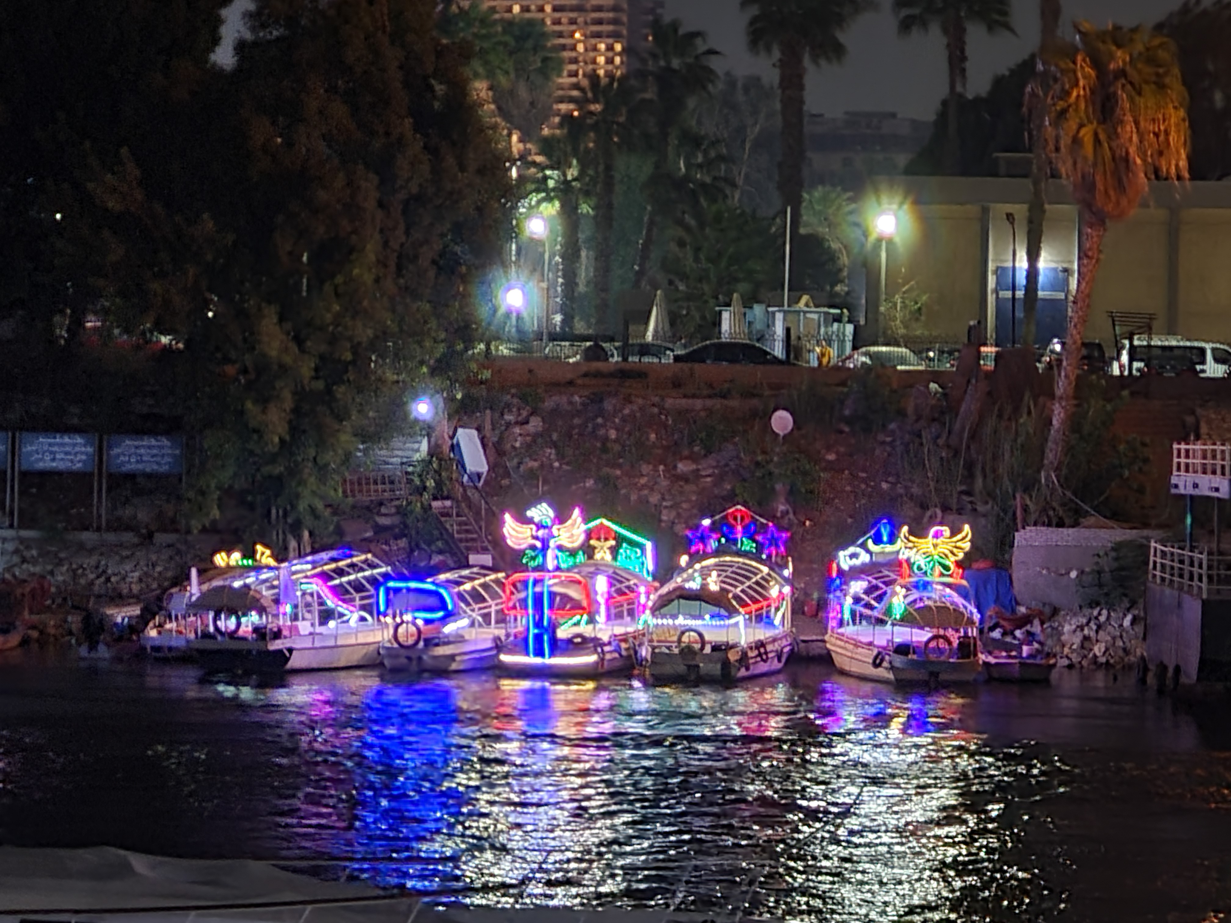 By the time we crossed the last bridge to our Giza hotel the blazing sun had given way to dusk and the intense heat lifted. In the darkness the city seemed to slow down and grow hushed. Food vendors magically appeared on the bridge, setting up chairs and lights around their carts. Families and groups of friends hung over the railing, watching the party boats below, lit in bright neon, heading out for an evening cruise on the Nile.